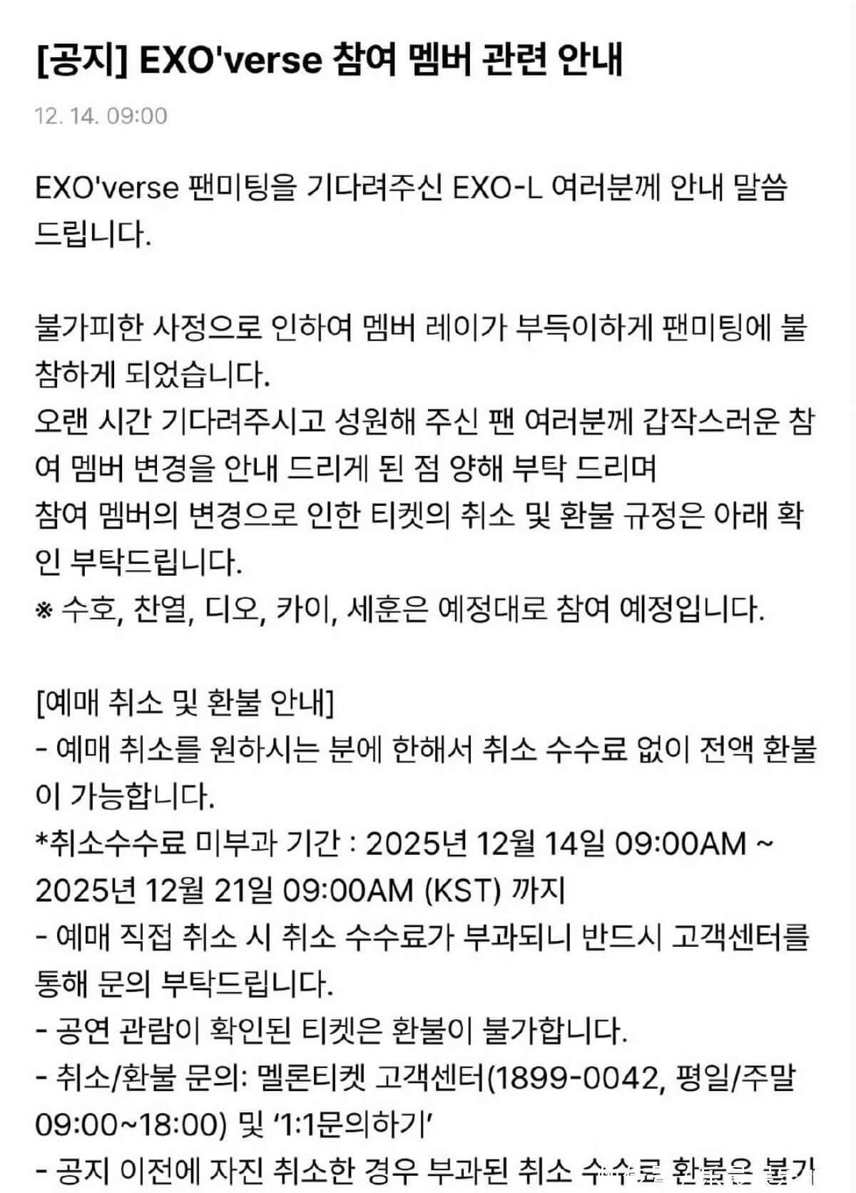 结果在粉丝见面会举办这天,经纪公司 SM 突然发出声明,表示因不可预见的因素,成员LAY张艺兴不得已将缺席这次的粉丝见面会,突然的参加成员变更,希望得到长时间等待和应援的粉丝们的谅解,SUHO、灿烈、D.O、KAI、世勋将会按计划参加活动。